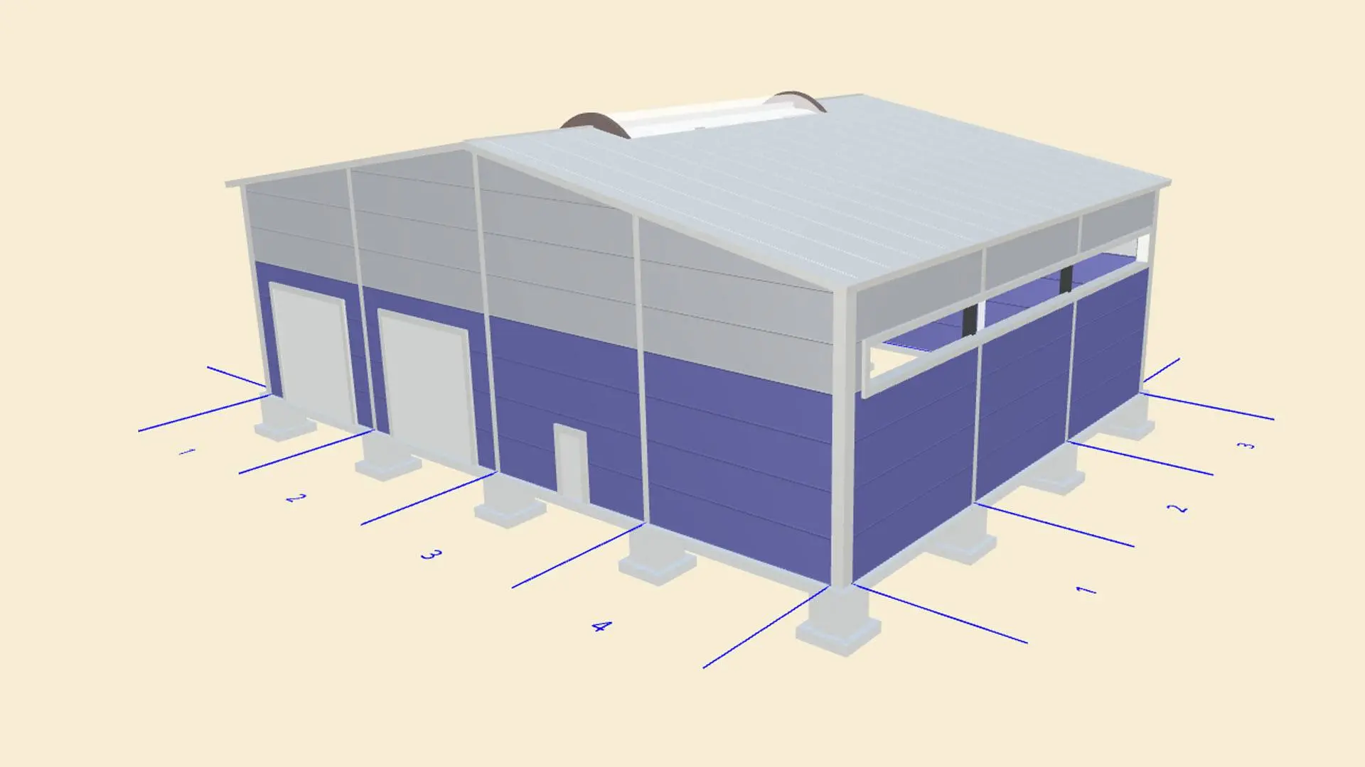 Весь стальной каркас обшивается негорючими сэндвич панелями (стены – 120мм и кровля – 150мм) В комплект здания включены 2 габаритных секционных ворота 4Ш х 4.2В и противопожарная дверь 1Ш х 2.1В. Для фасадных решений выбраны 2 классических цвета: синий RAL 5005 и серый RAL 7004.