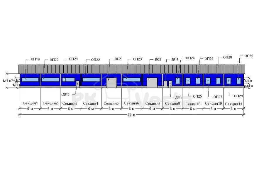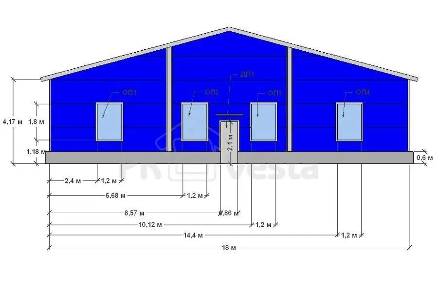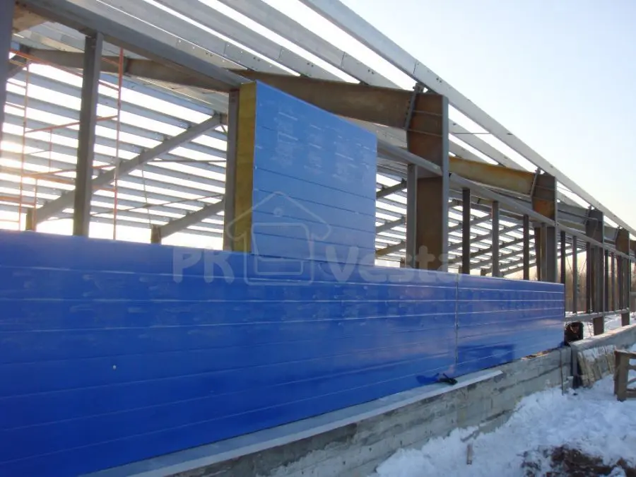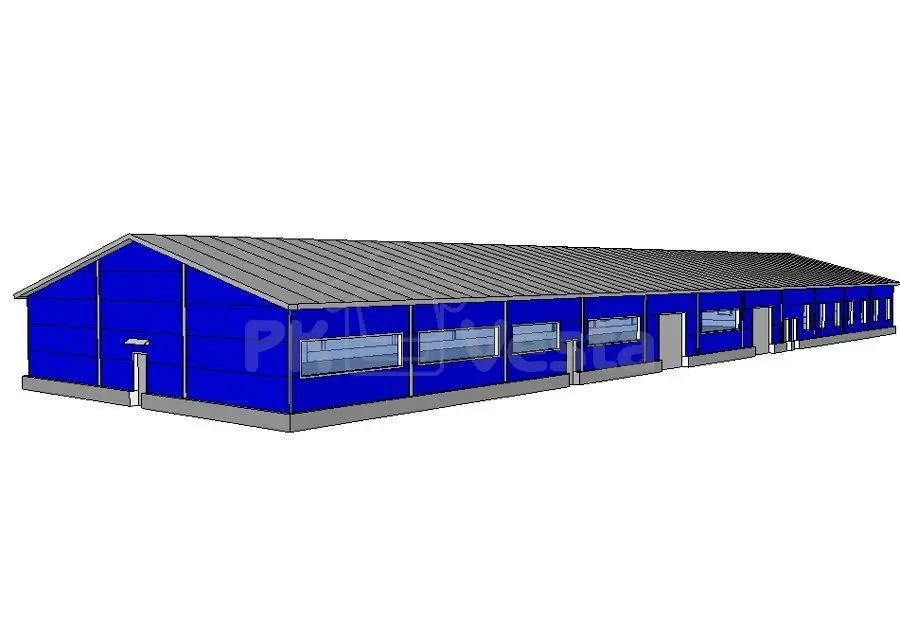 Полнокомплектное здание состоит из офисной части и небольшого производственного цеха. Цветовая гамма была выбрана классическая: стеновые сэндвич-панели синего цвета и светло-синяя кровля. Быстровозводимое здание из сэндвич-панелей было полностью спроектировано в бесплатной онлайн-системе WebSteel самим клиентом.