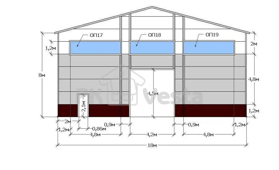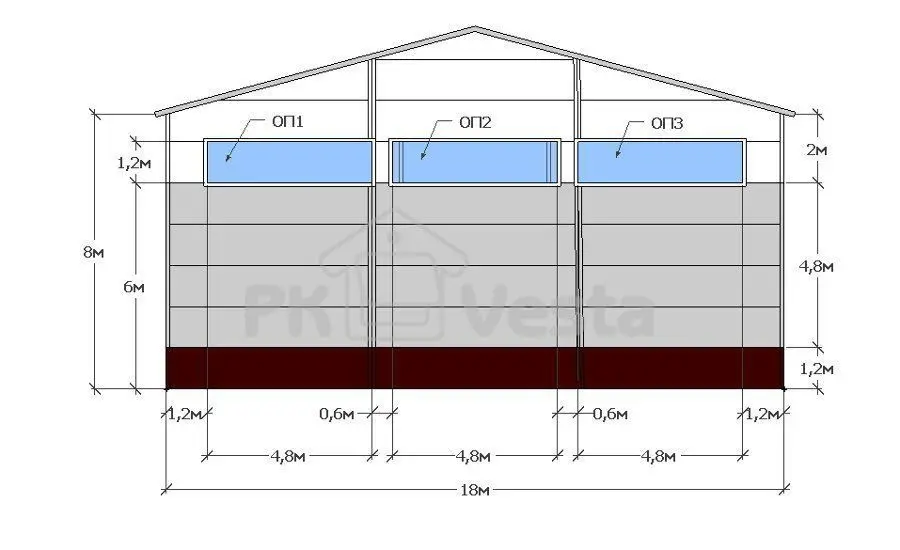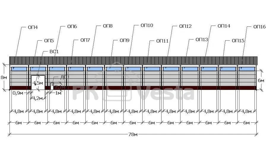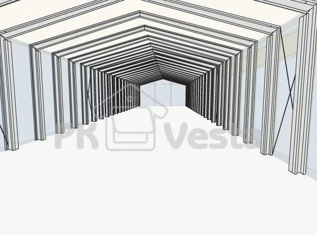 В комплект здания входят стальной каркас, ограждающие конструкции (сэндвич-панели), подкрановые пути (с учетом грузоподъемных опорных механизмов на 5 тонн), саморезы, болты и гайки. Весь комплект изготавливается на одном заводе. ПК "Веста" также БЕСПЛАТНО предоставляет 3 раздела проекта: КМ (конструкции металлические), АР (архитектурное решение) и КЖ (конструкции железобетонные - фундамент). Тип фундамента - точечный с ростверком.