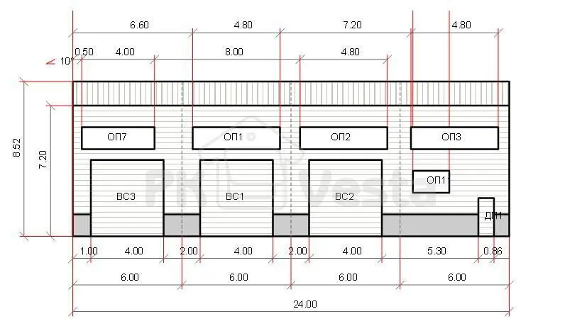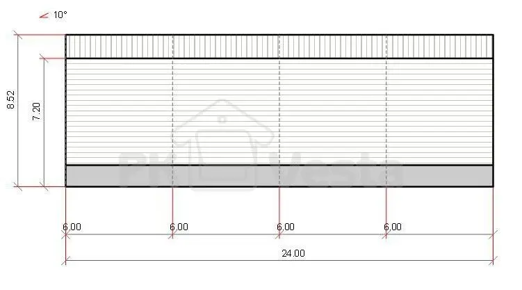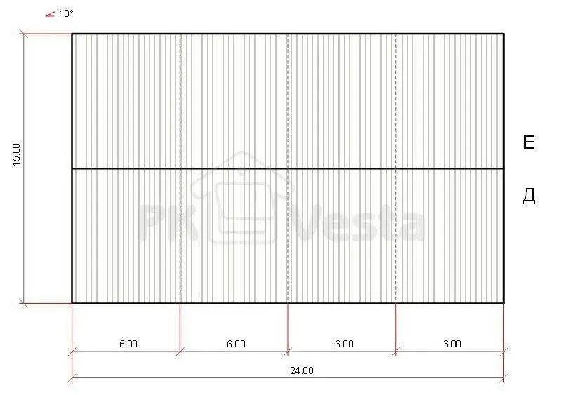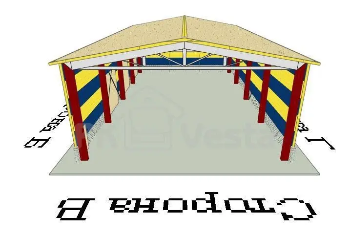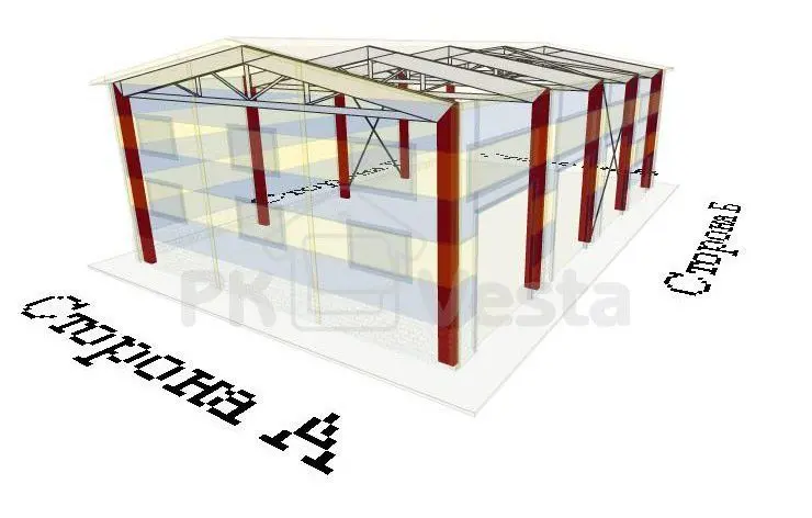 Тип конструкции выбран двухскатный на базе гибридной схемы (колонны из черного металла С245 и трапециевидная ферма сверху - из ЛСТК - холодногнутых оцинкованных профилей) В комплект здания включены сэндвич панели, фасонные и крепежные элементы.