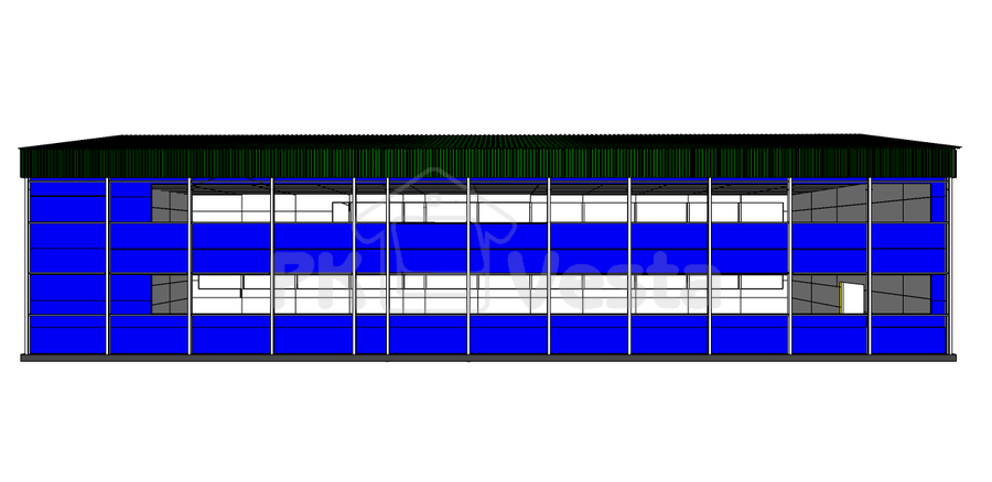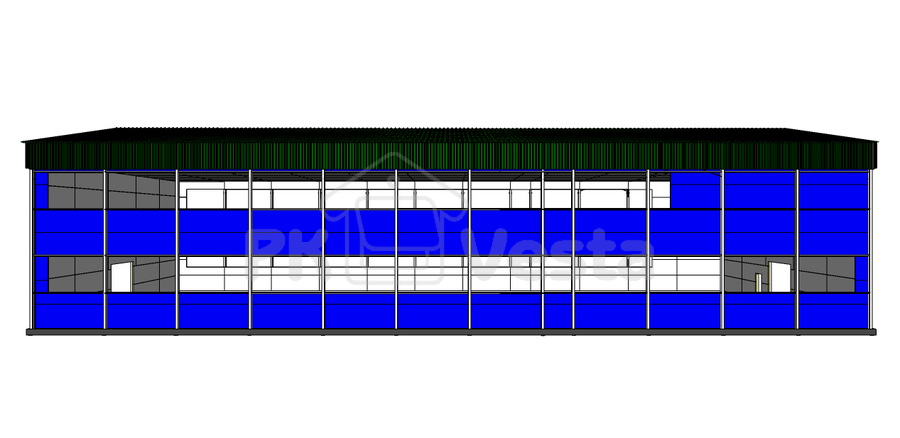 Конструктив быстровозводимого здания предусматривает «внутренний тепловой контур» (вся обшивка будет зашиваться изнутри здания на колонны и нижний пояс фермы) Сама трапецевидная ферма будет защищаться проф листом от снеговых мешков сверху и по высоте фермы с нахлестом. Выбрана наиболее проверенная ГИБРИДная система (для следующих климатических зон в России: V снег и V ветер с сейсмикой до 6 баллов) на базе комбинирования двух самых известных технологий в мире в нежилой строительной отрасли: ЛМК (классическая сварная балка из черного металла) и ЛСТК (фермы и прогоны из холодногнутых облегченных оцинкованных профилей) Двух этажное исполнение выполнено с учетом межэтажной балки и будущих полов (на базе «несъёмной опалубки») с сеткой колонн 6х6 на первом этаже. Весь стальной каркас будет обшиваться негорючими сэндвич панелями по 150мм на стены и кровлю (с минераловатным наполнителем) со специальной защитой в стыках панелях. В комплект здания входят все фасонные и крепёжные элементы. Применяются элементы для здания только с самым высоким уровнем качества (I класс цинкования металла - 275 г/кв.м., С245 и С350 металлы, плотность минваты - не менее 110 кг/куб.м., толщина проф листа - не менее 0.5мм, самые современные иностранные клеевые растворы для адгезии панелей и т.д.)