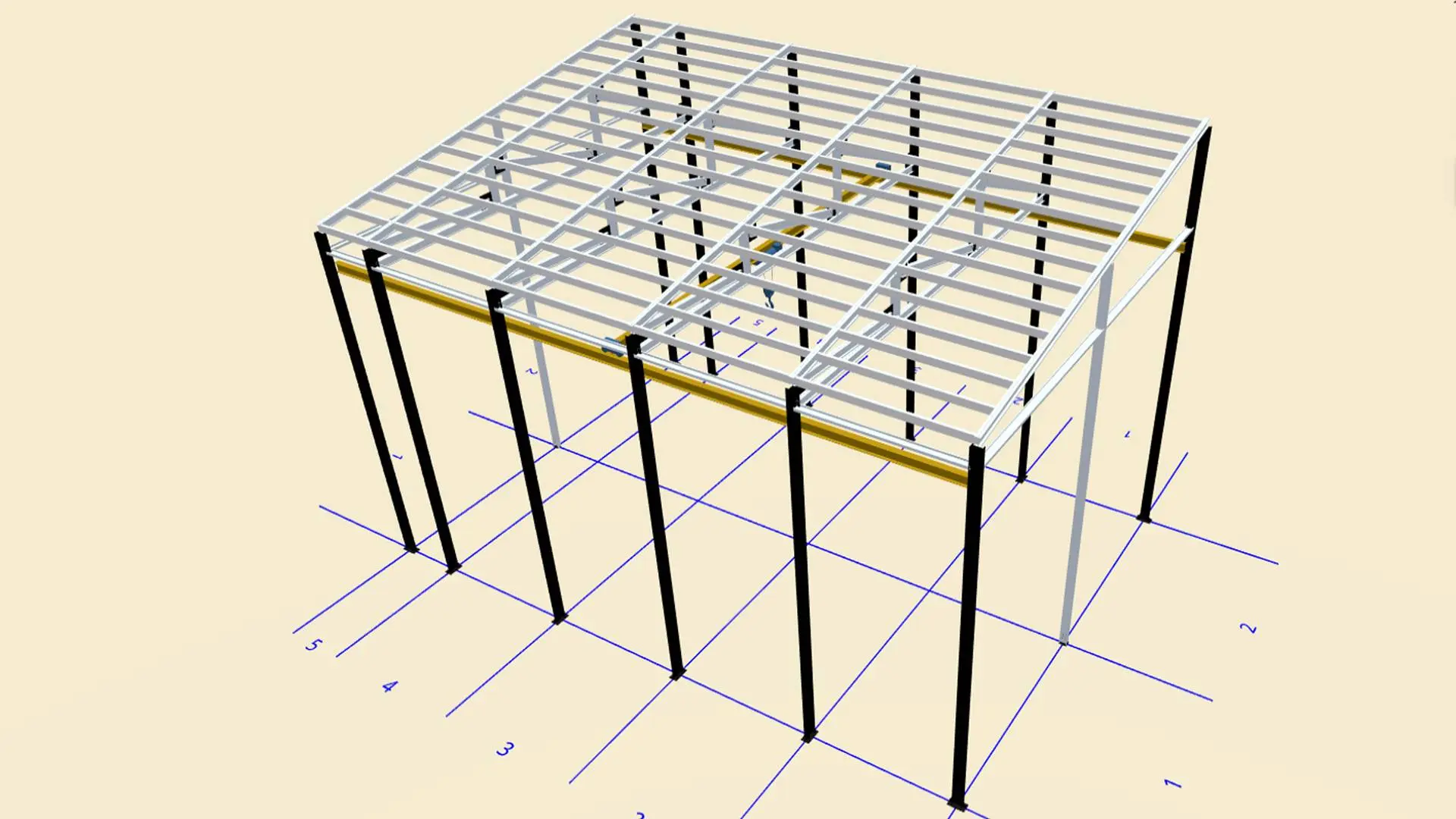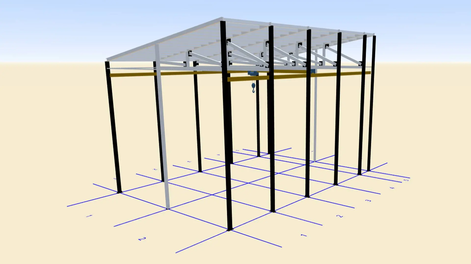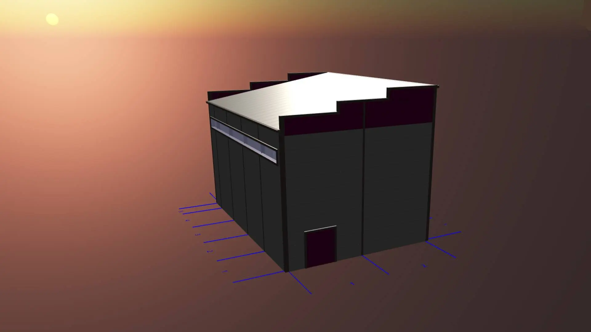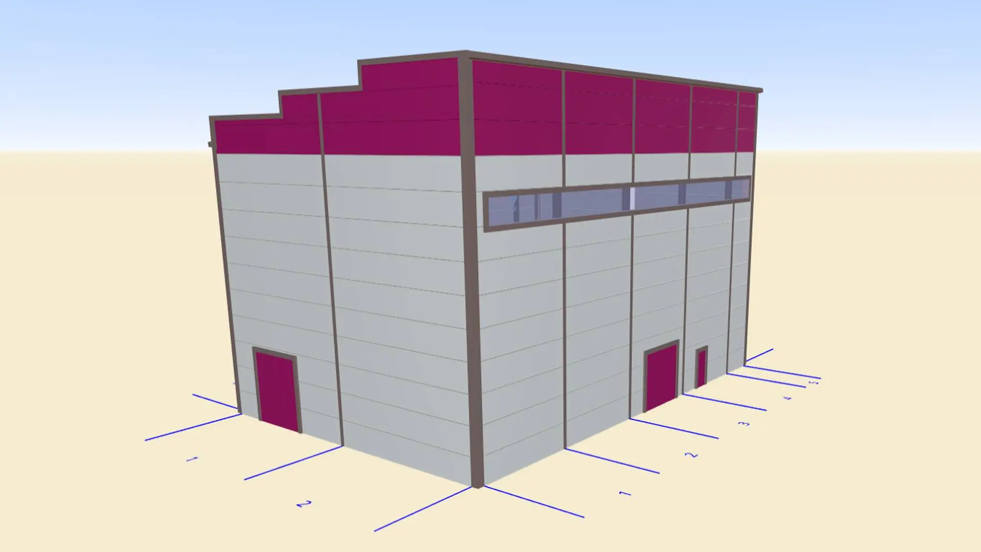 Несущий каркас из легких металлоконструкций спроектирован на базе надежной ГИБРИДНой системы (сочетание ЛМК – колонны сделаны из сварной балки, а фермы и прогоны из ЛСТК – холодногнутые оцинкованные профиля) Учтена нагрузка от опорной кран балки в 3.2т по всей длине здания. Металлический каркас обшивается негорючими сэндвич панелями из минваты (стена/кровля – 100/120мм) В комплект здания включены все крепежные и фасонные элементы. Размещены 2 секционных ворот в торце и по длинной стороне (3х3 и 4.2х4.5 с калиткой) Выбрана нейтральная цветовая гамма в стиле модерн (светло-серый, красный и белый)