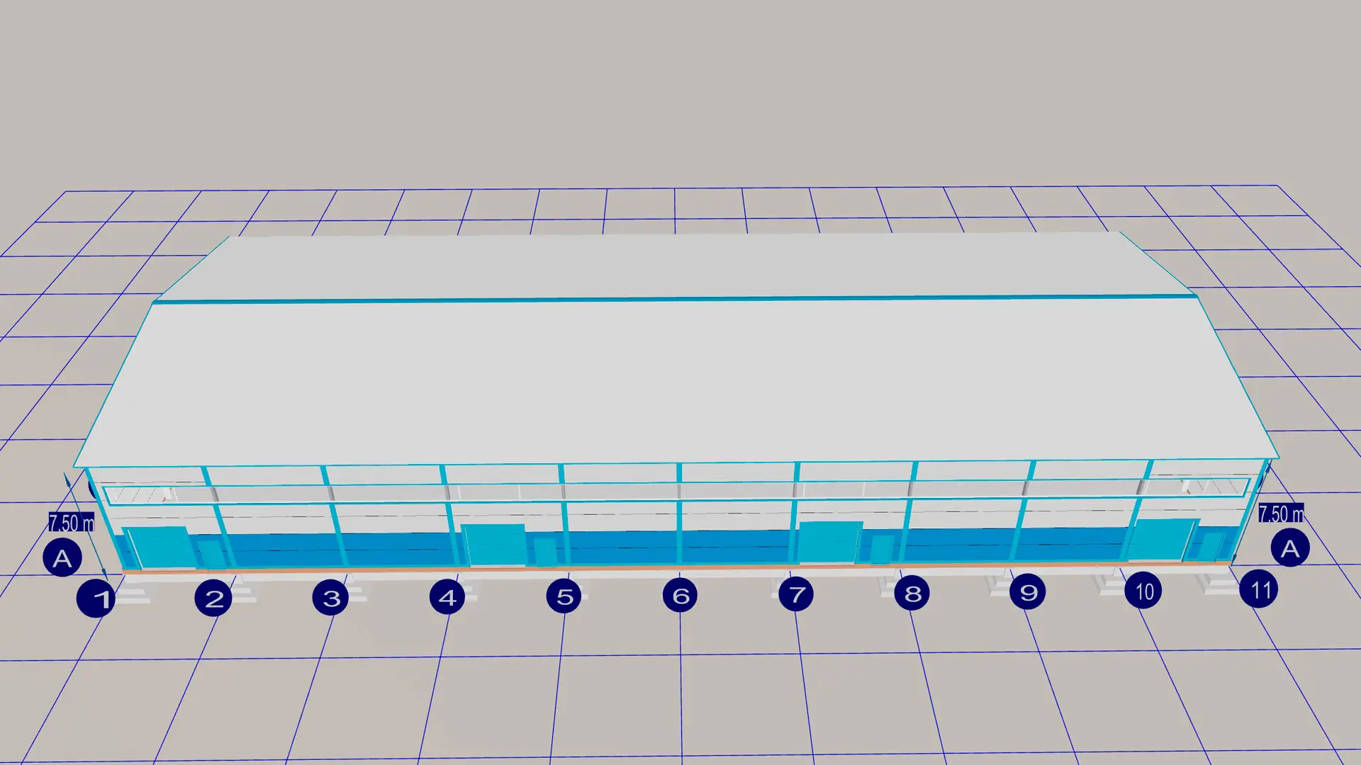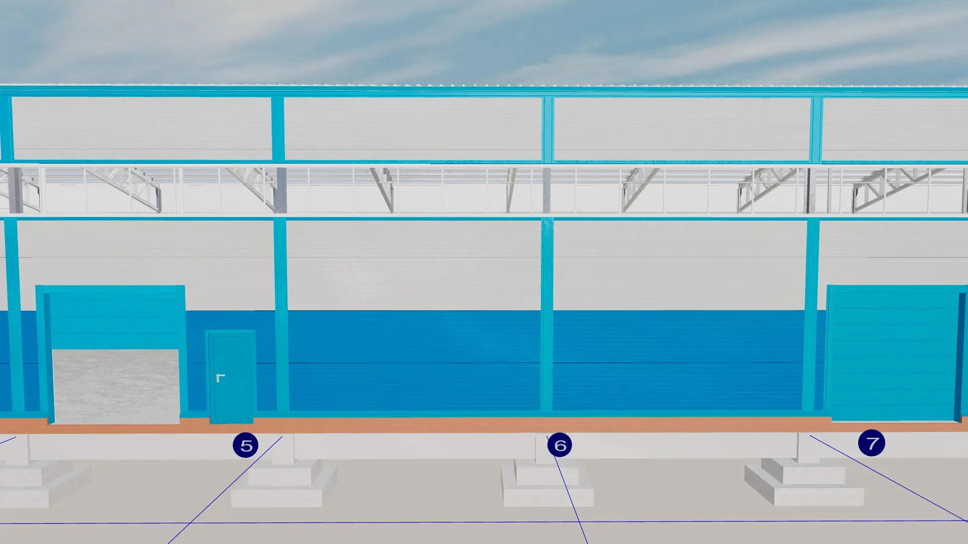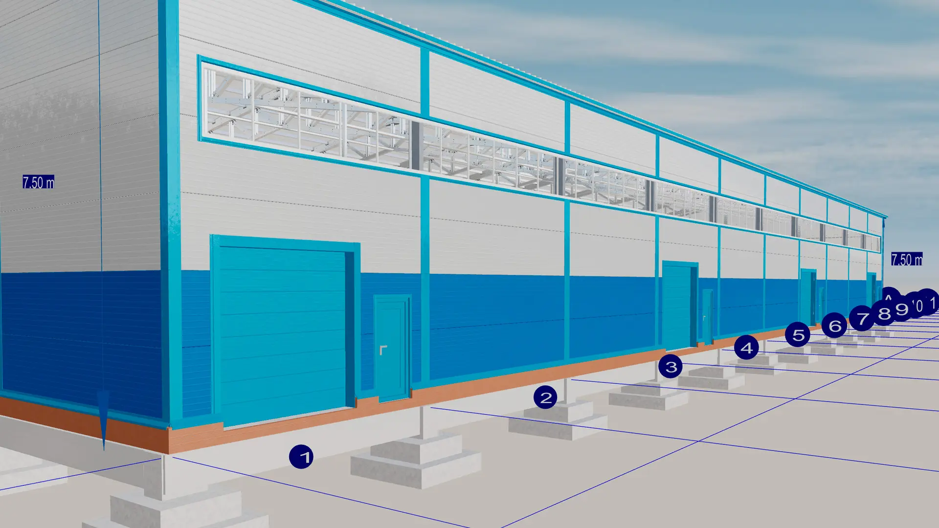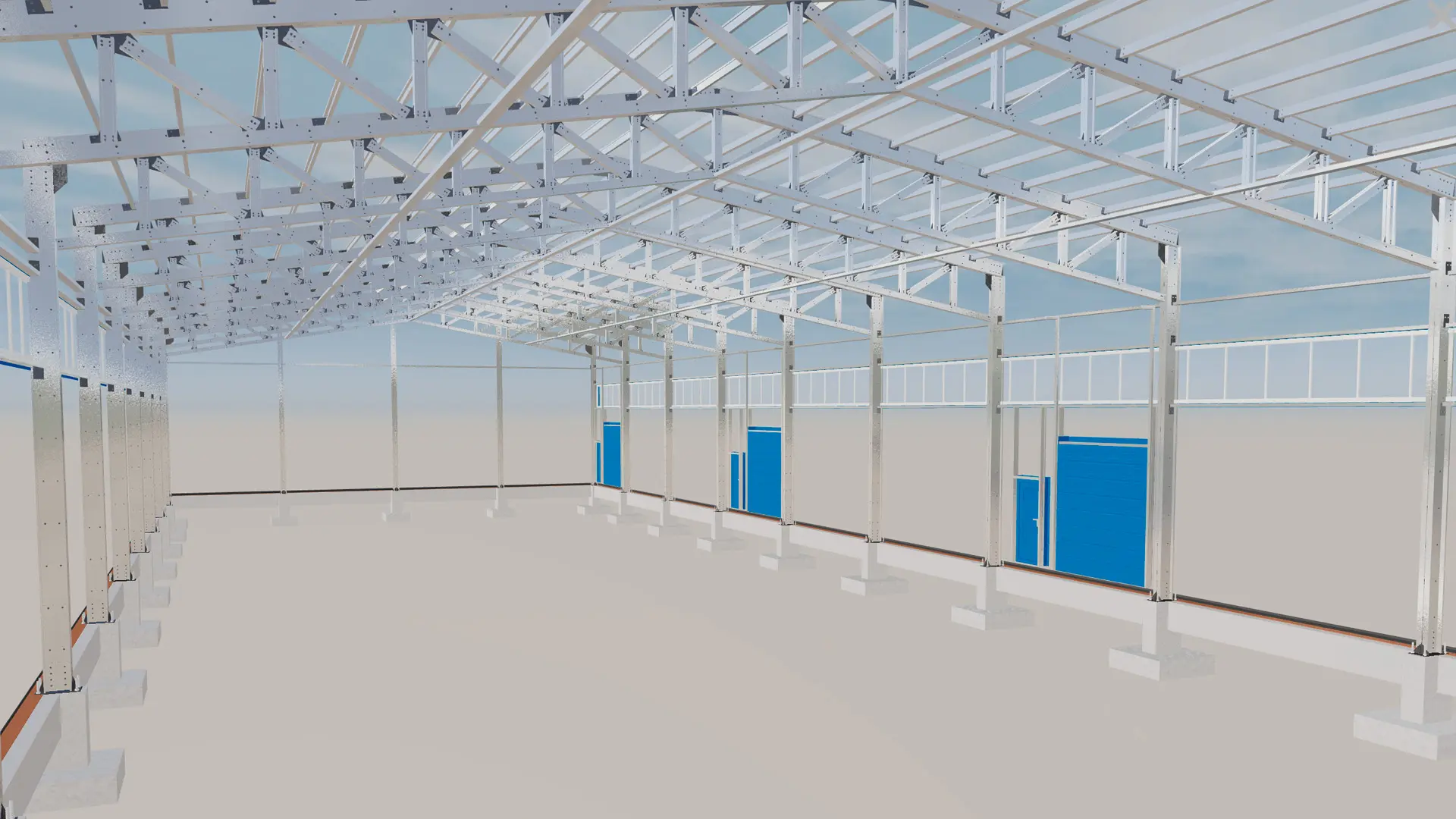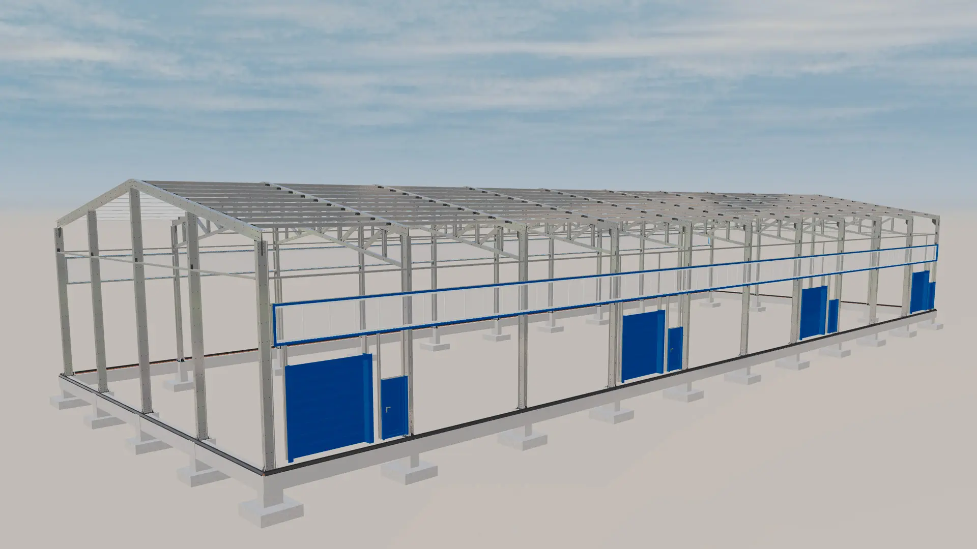 Однопролётной стальной каркас без колонн внутри рассчитан полностью на базе технологии ЛСТК (холодногнутый профиль) на базе высокопрочных марок сталей (до С420) с толщиной до 3.5мм. Обеспечивается 100% защита от коррозии. Обшивка применяется в виде негорючих сэндвич панелей. В комплект здания включены все фасонные и крепёжные элементы.