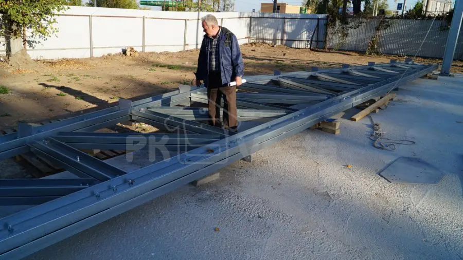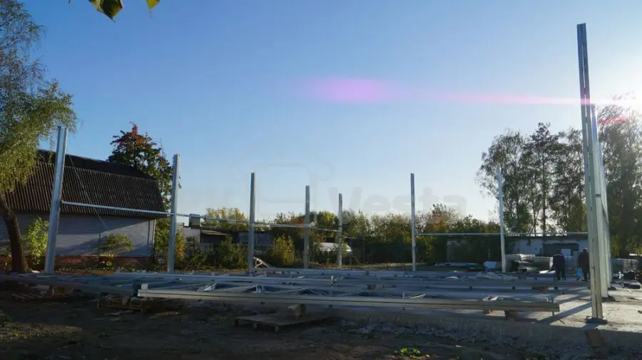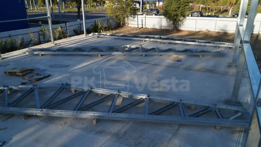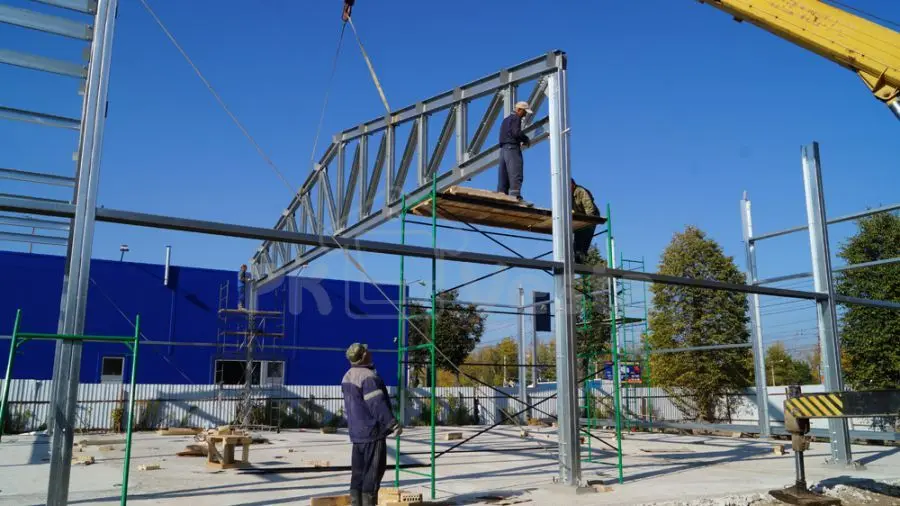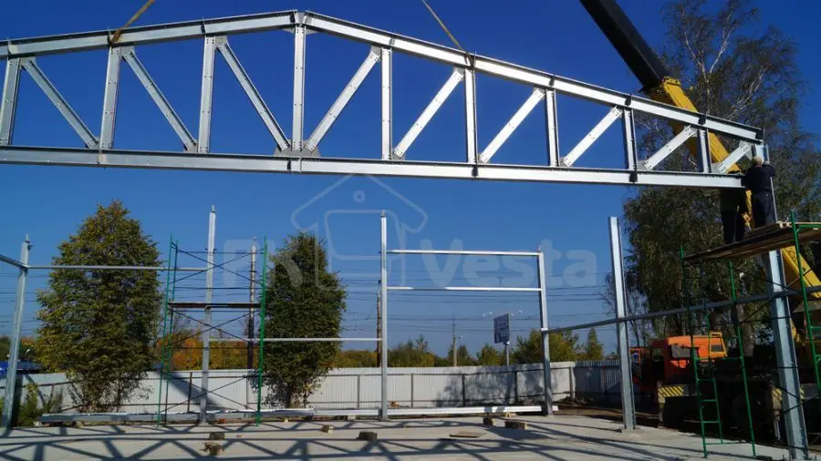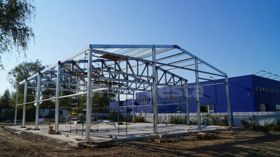 ПК "Веста" объявляет о завершении монтажа стального каркаса для дилерского центра Peugeot в г. Тула (серия INDI - 18Шх23Дх6В). Каркас смонтировала бригада из 4 человек примерно за 1 неделю (3 дня - на колонны и прогонную часть и 2 дня на несущие стальные фермы и аренду крана). Все усиленные конструкции для проемов (двери, ворота и окна) были учтены. Все элементы в каркасе сделаны из первоклассной стали (350 МПа, 275 г/м2).