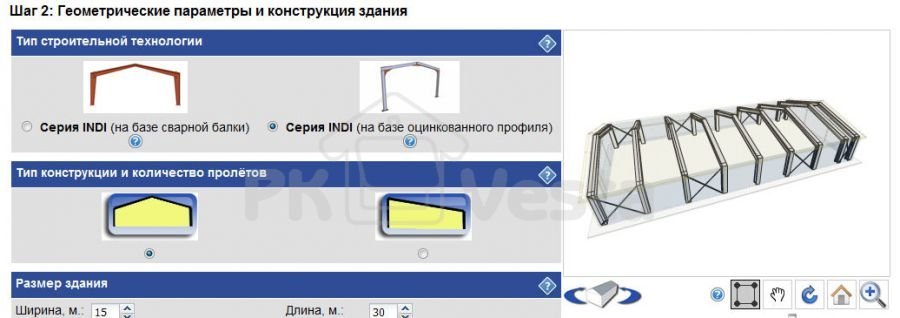 Бесплатная он-лайн система WebSteel автоматически выбирает строительную технологию, шаг колонн и диагональные связи с учетом пролетности и других параметров, что учитывается при работе с проемами для ворот/дверей и окон.