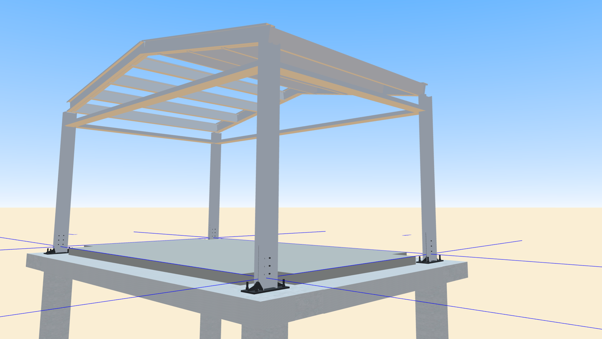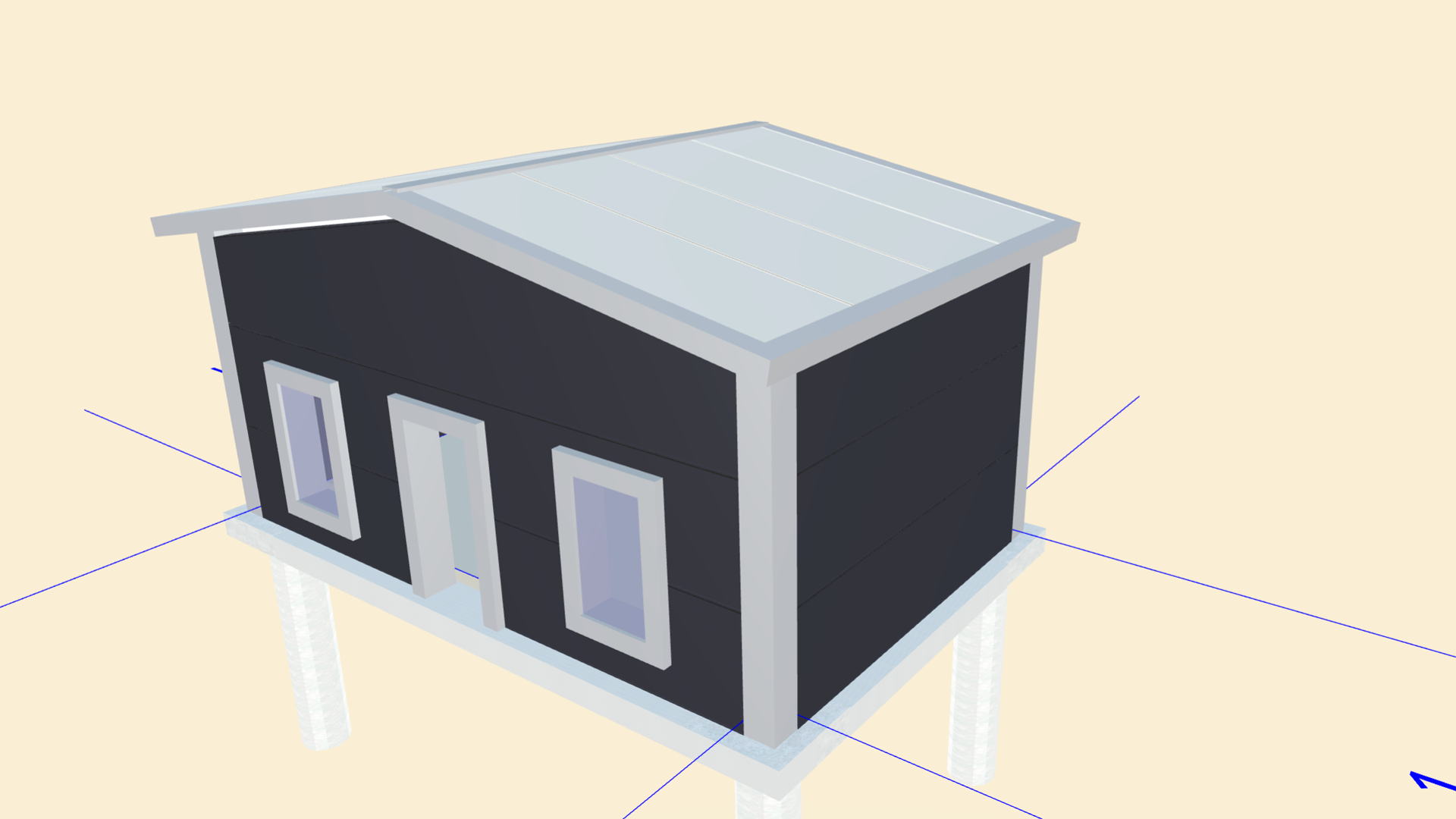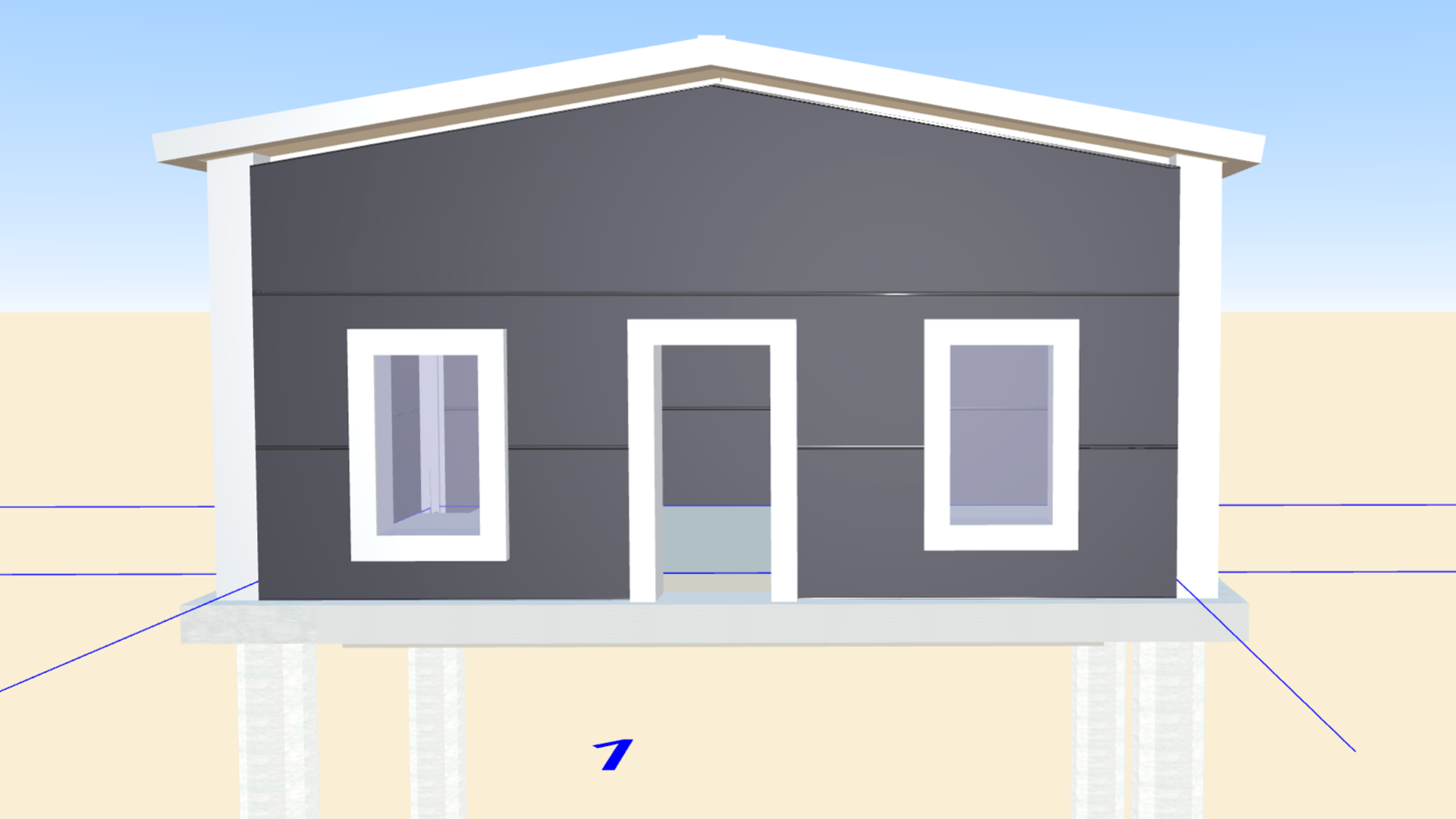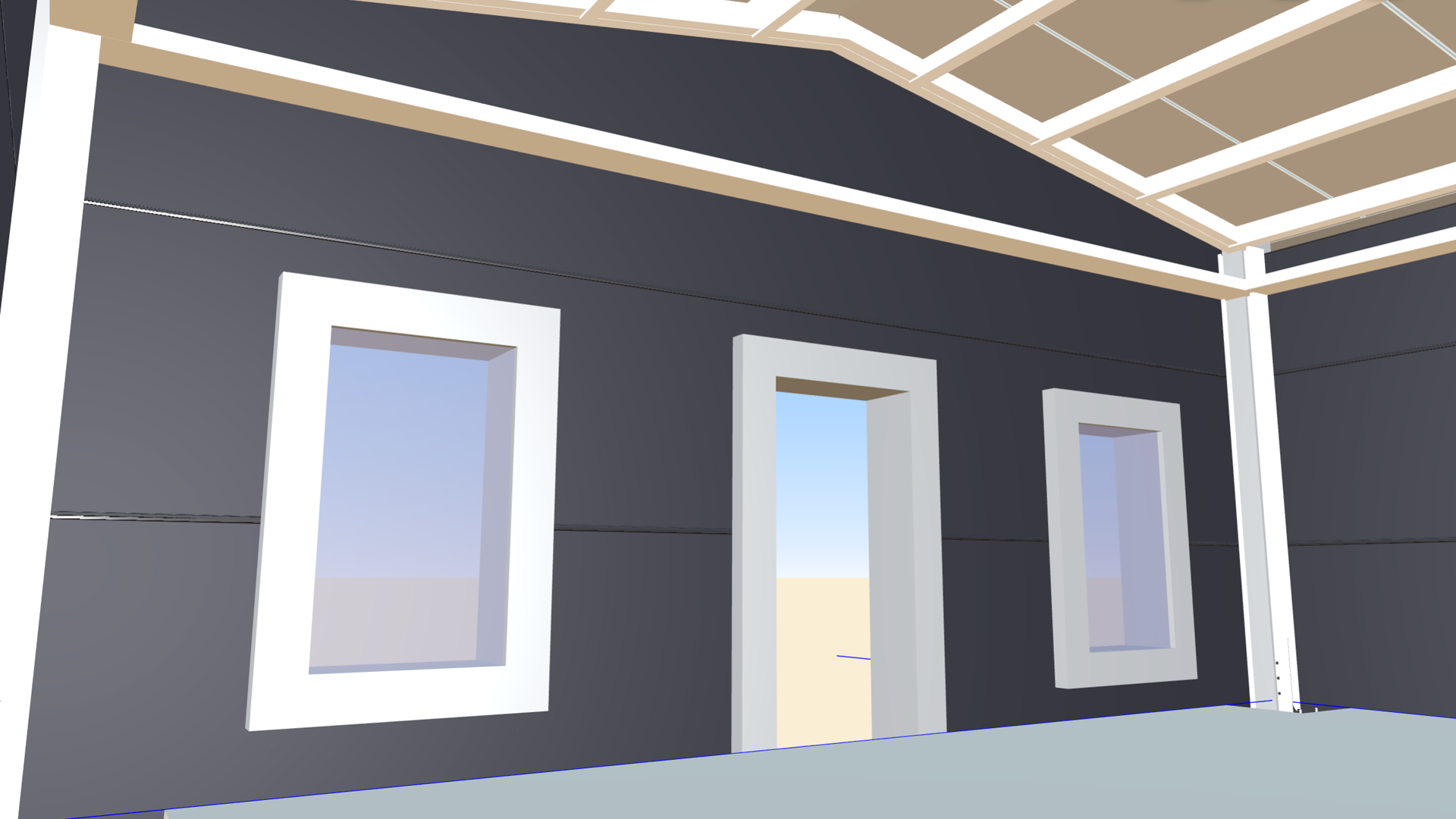 Все проектируется на базе облегченной технологии ЛСТК (колонны, балки и прогоны) и обшивается негорючими сэндвич панелями (100мм на стены и 120мм на кровлю на базе минваты) В комплект здания включены все фасонные и крепёжные элементы. В торце учтен пустой проем с усиленной конструкций для монтажа стеклопакетов с французскими окнами. Выбран строгий корпоративный стиль в черном цвете (RAL 9005)