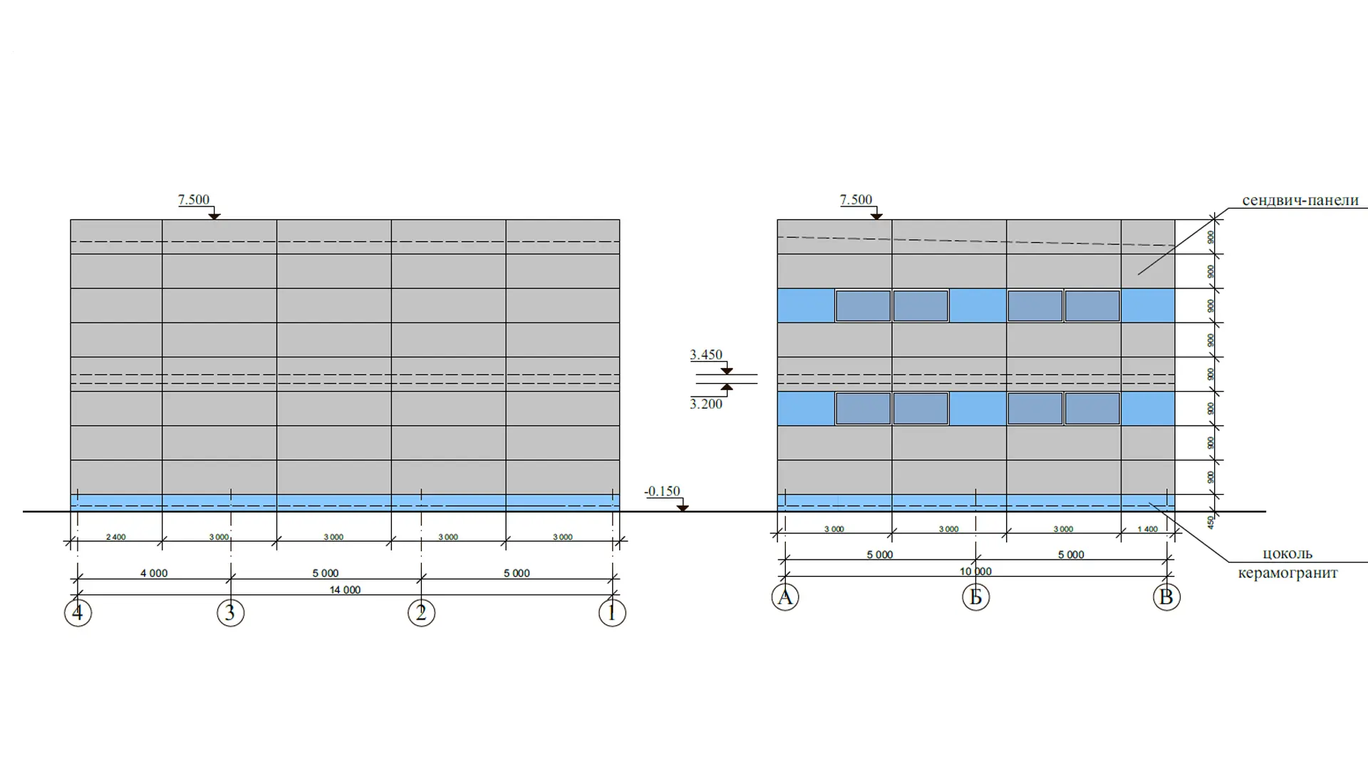 Легкий металлокаркас базируется на известной гибридной технологии (ЛМК+ЛСТК) и обшивается негорючими сэндвич панелями (стены и кровля – 150мм, минвата) В комплект здания включены секционные ворота и несколько дверей. Для фасадов клиент выбрал нейтральный строгие серые цвета с сочетанием белого.