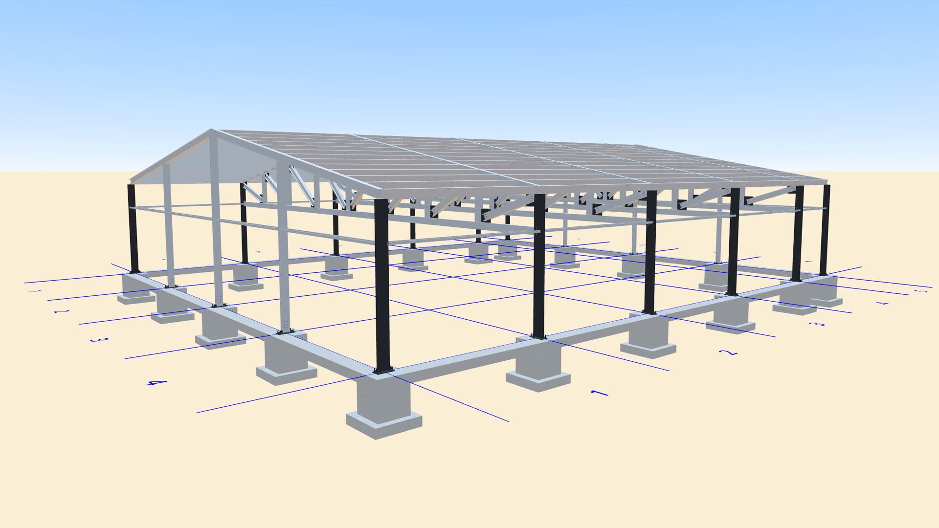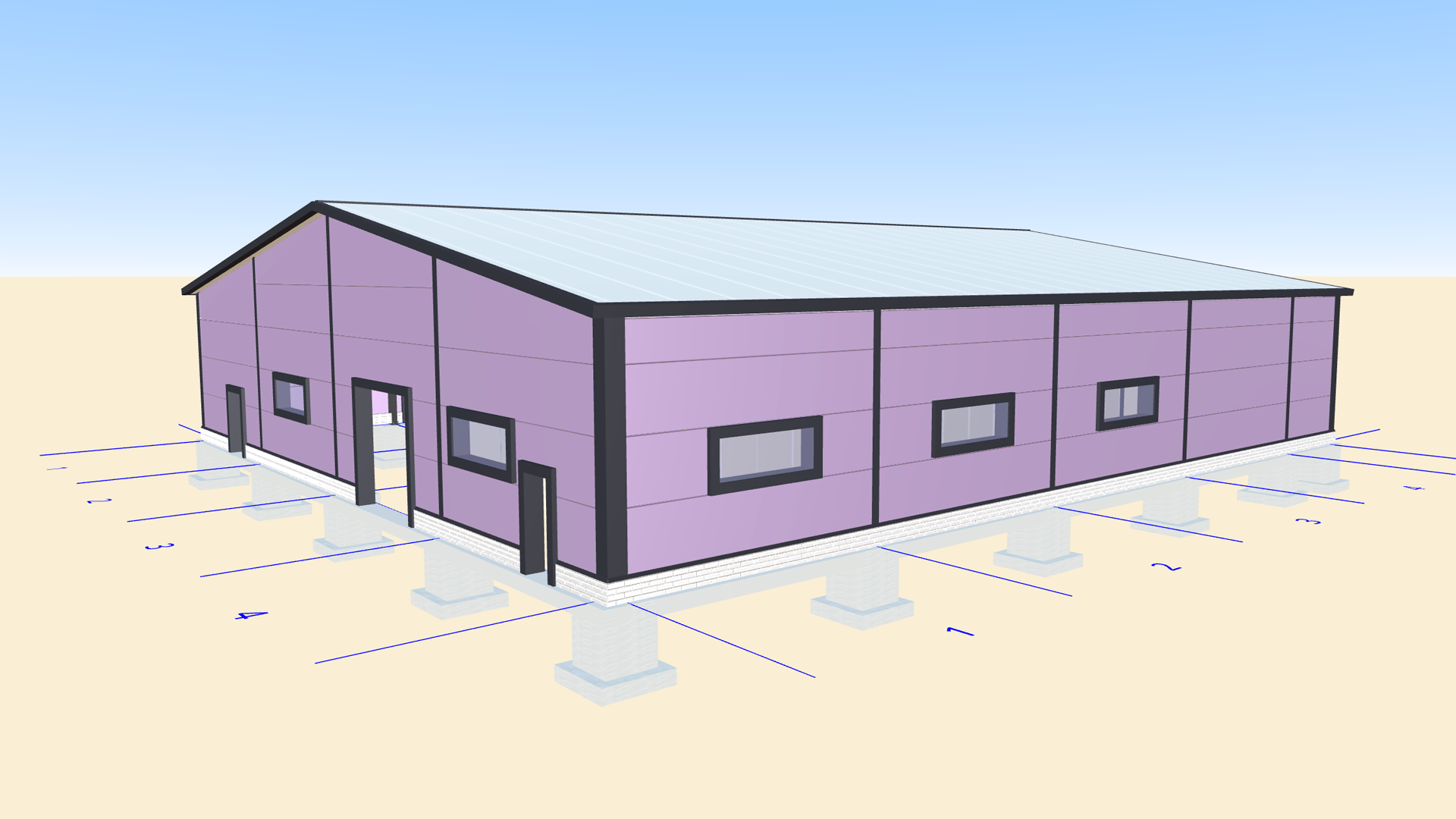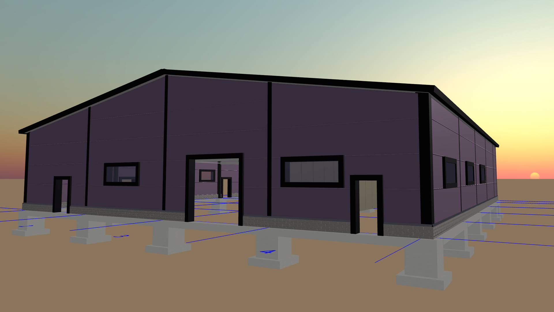 Несущий стальной каркас проектировался в бесплатной онлайн системе WebSteel на базе надежной гибридной системы (сочетание черного металла и холодногнутого оцинкованного профиля) В комплект здания включены все ограждающие конструкции (негорючие сэндвич панели с 120мм для стен и 150мм для кровли), внутренние перегородки, фасонные и крепежные элементы. Для всех пустых проемов в стенах учтена усиленная конструкция для обеспечения жёсткости.