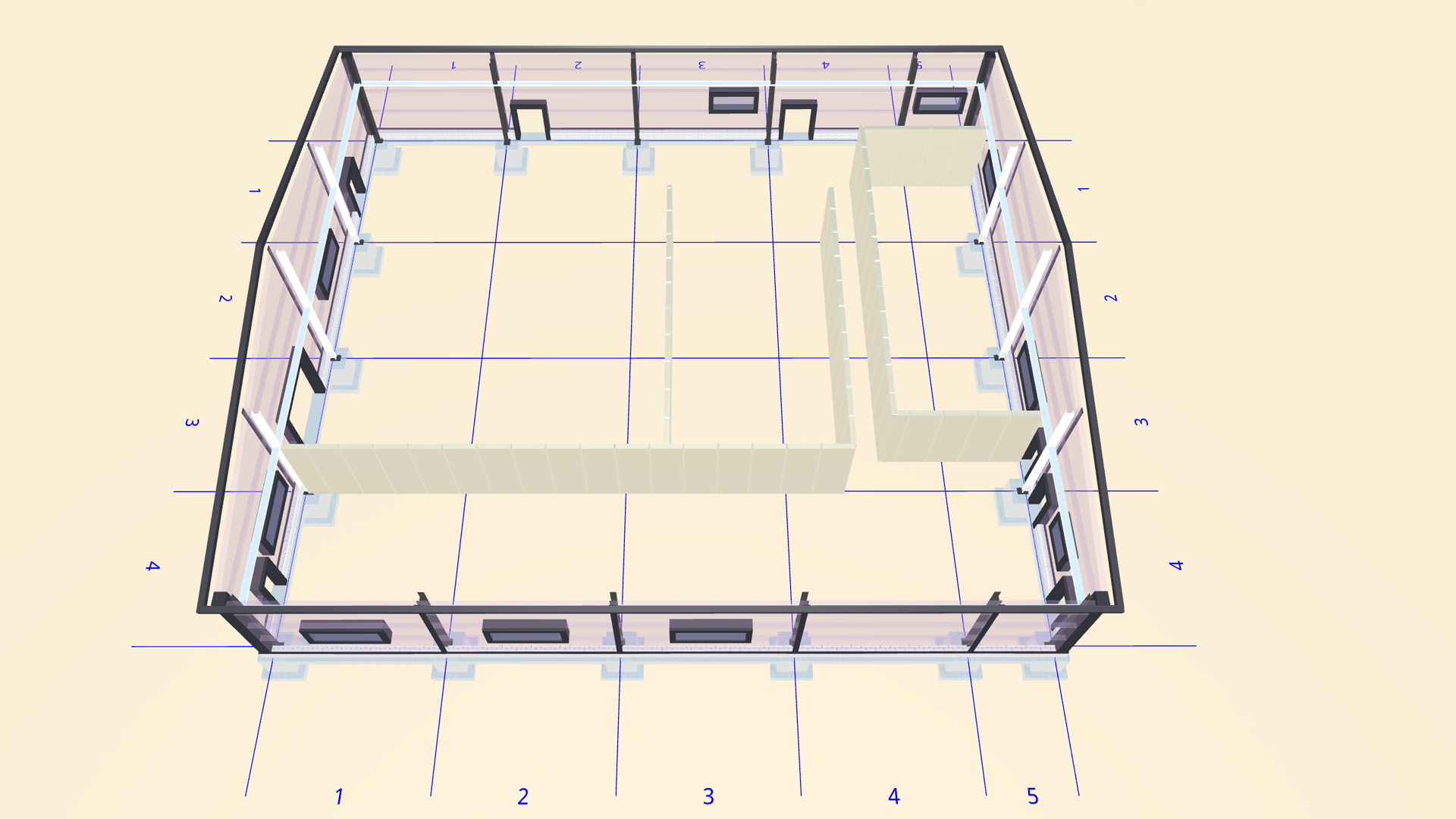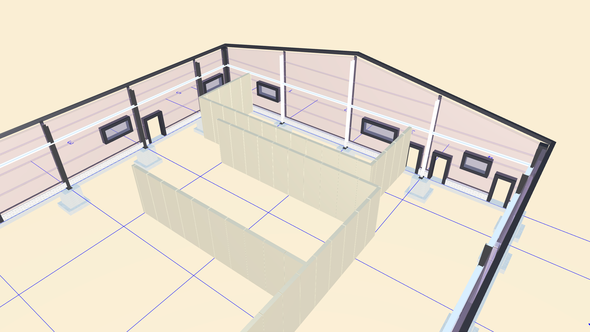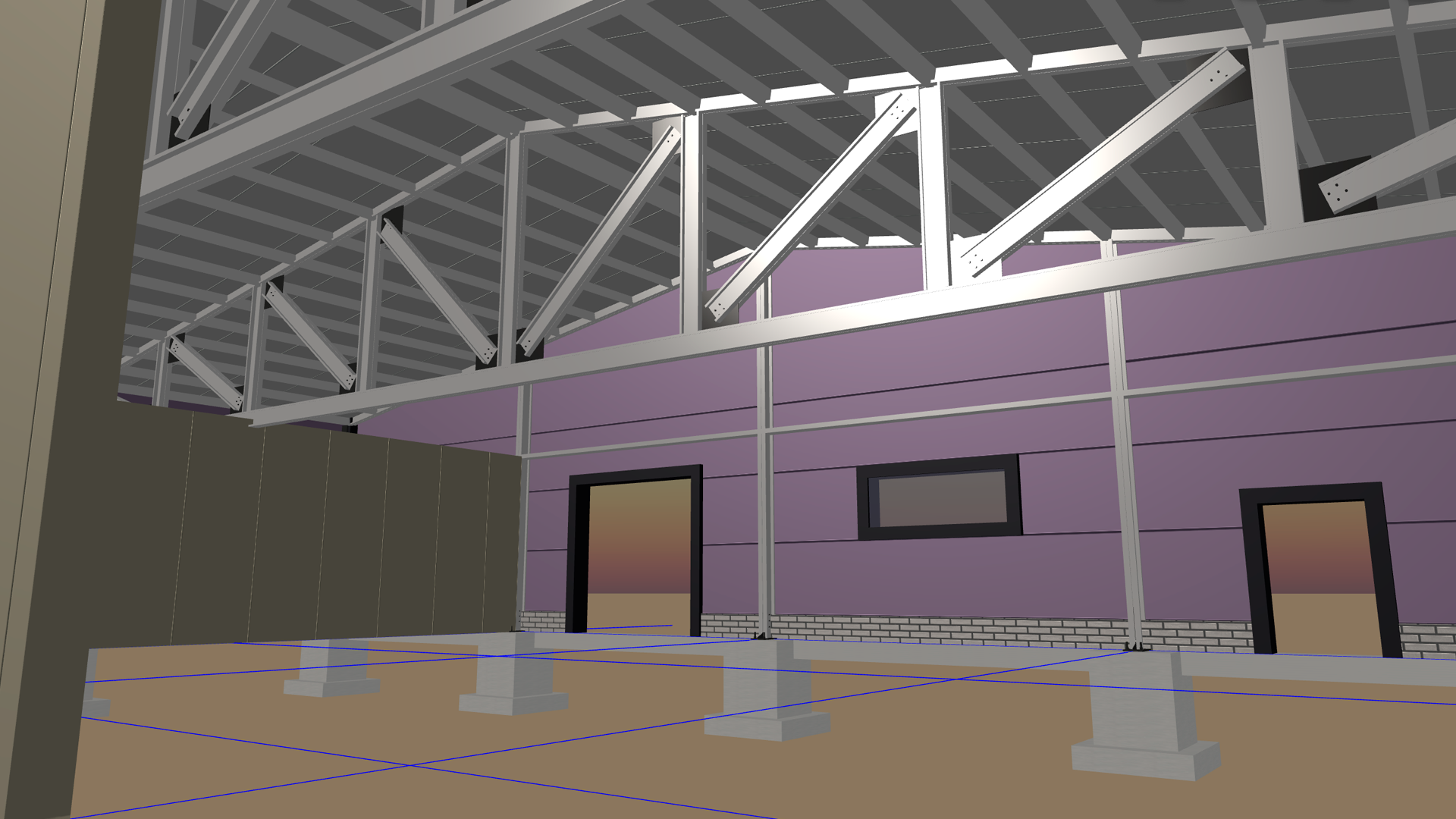 Несущий стальной каркас проектировался в бесплатной онлайн системе WebSteel на базе надежной гибридной системы (сочетание черного металла и холодногнутого оцинкованного профиля) В комплект здания включены все ограждающие конструкции (негорючие сэндвич панели с 120мм для стен и 150мм для кровли), внутренние перегородки, фасонные и крепежные элементы. Для всех пустых проемов в стенах учтена усиленная конструкция для обеспечения жёсткости.