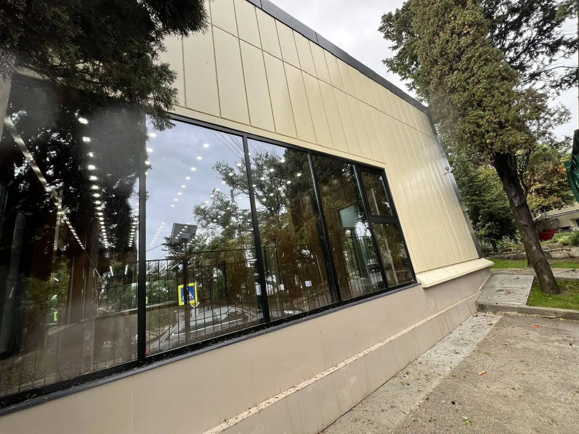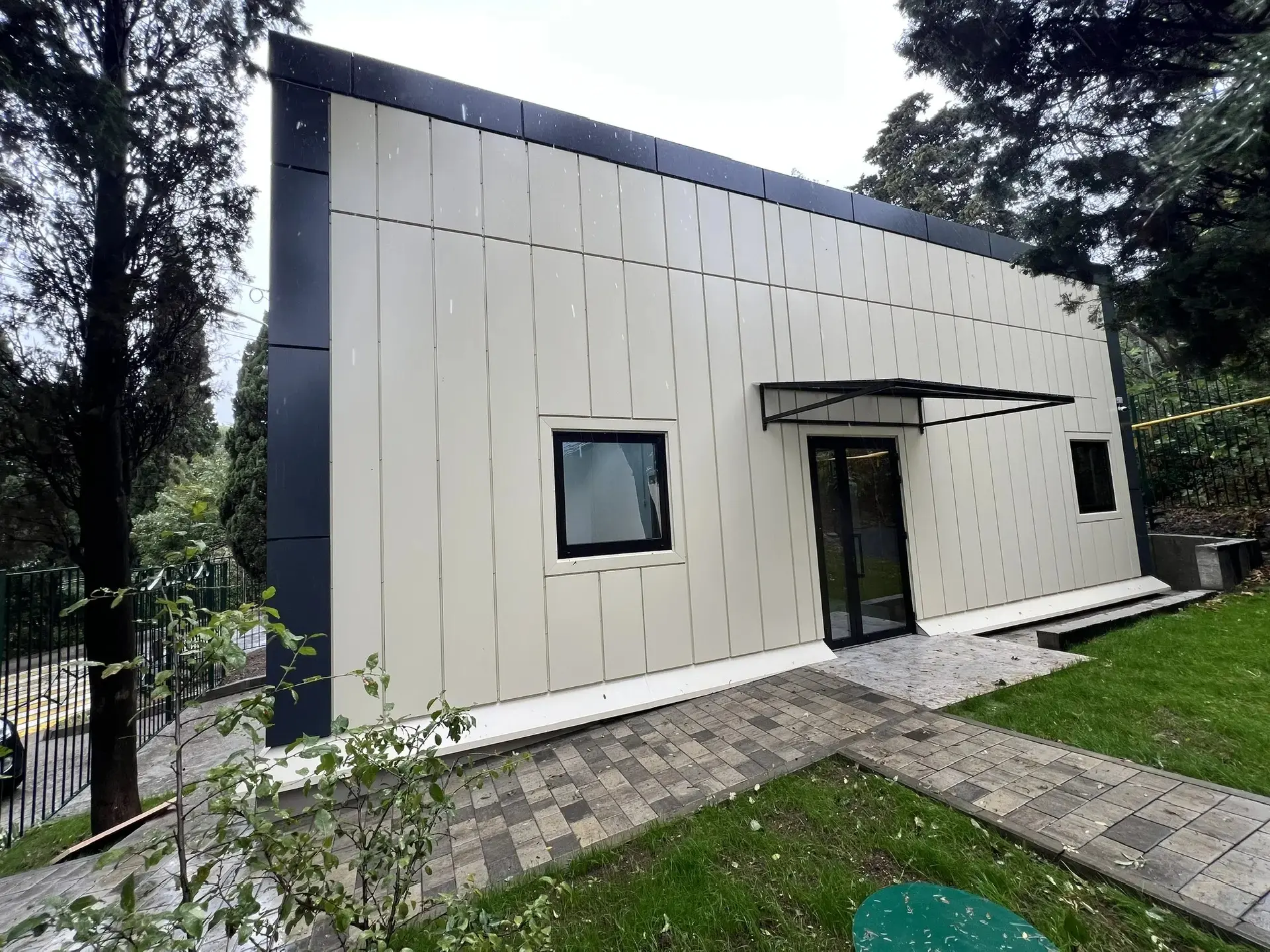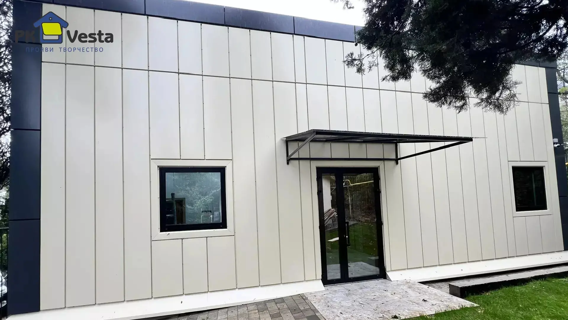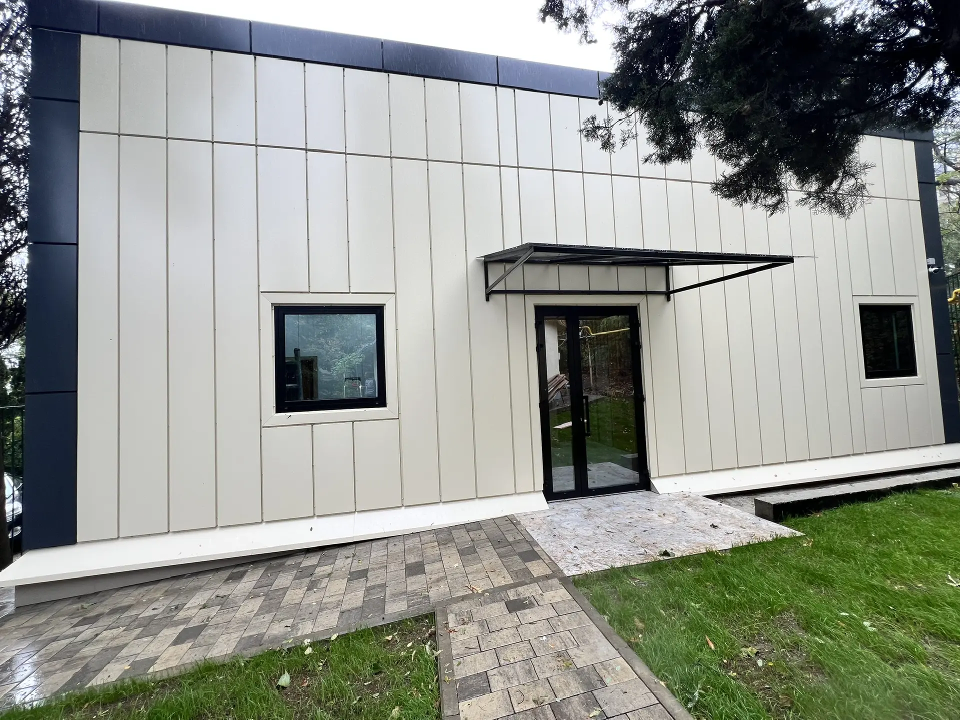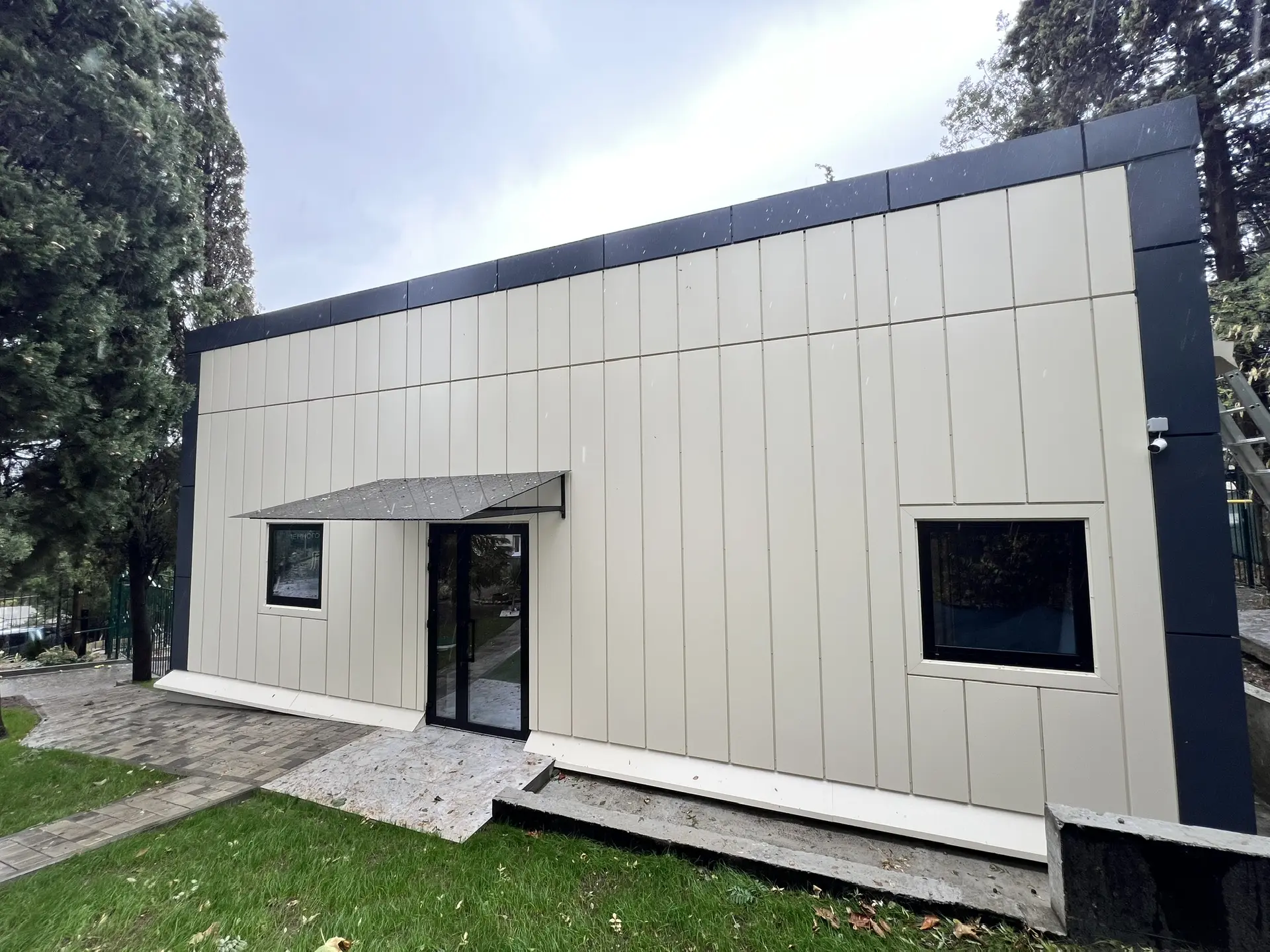 Стальной каркас был спроектирован на базе современной технологии ЛСТК (оцинкованный холодногнутый профиль), обеспечивающий 100% защиту от коррозии и 100% болтовое соединение без сварки и заклепок/саморезов.Для обшивки применили классические сэндвич панели (стены - 100мм ик ровля - 120мм с негорючим наполнителем - минвата) снаружи смонтировали вентилируемый фасада на базе вертикальных композитных кассет. При входе установили прозрачный стеклянный козырек.